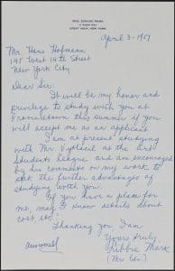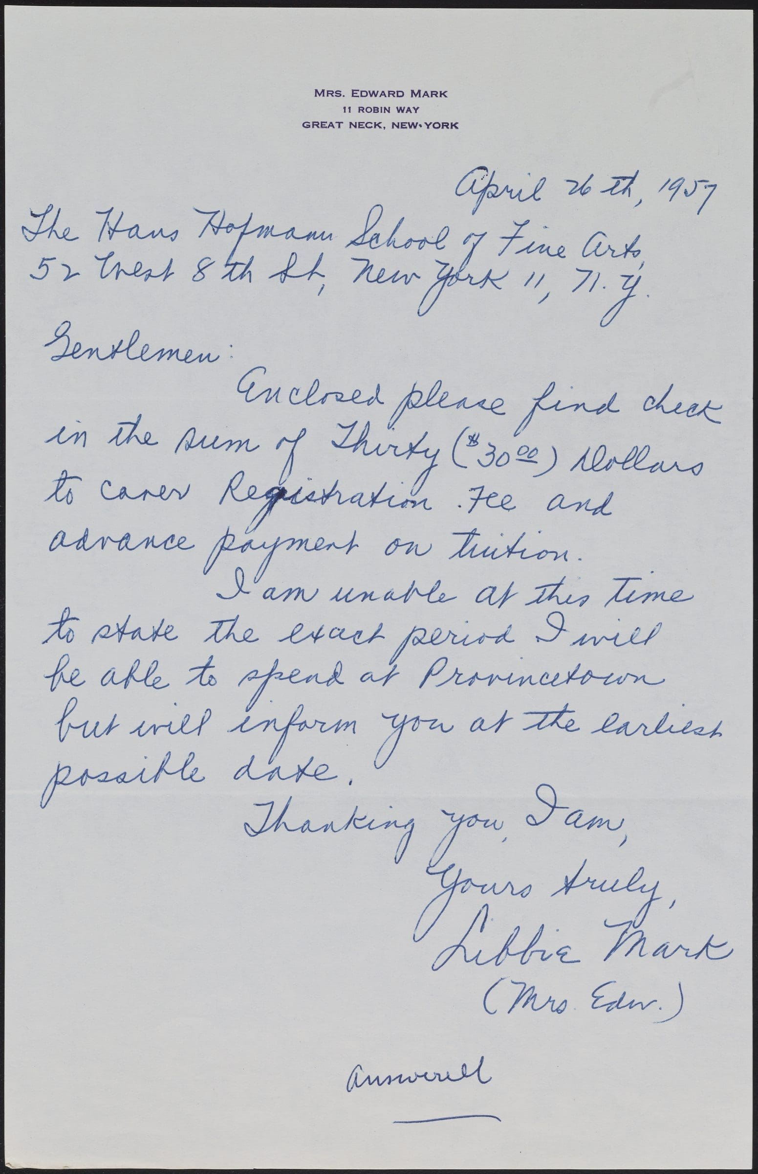 Hofmann must have responded with an acceptance letter, as Mark followed up with a second letter dated April 26, 1957, in which she enclosed $30—her registration fee of $5 and advance tuition payment of $25—and stated that,