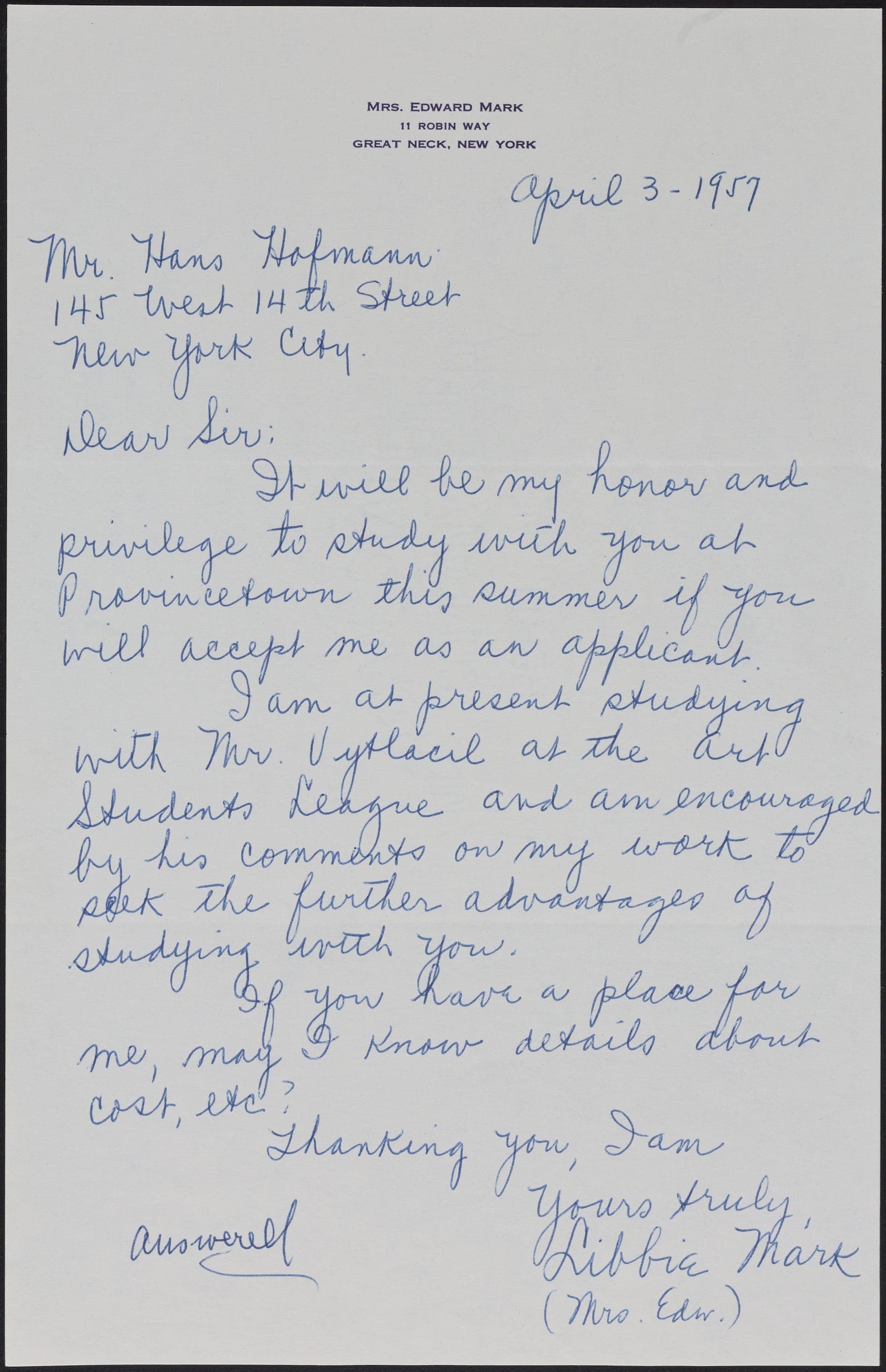 18. Mark’s registration, attendance, and financial paperwork as well as correspondence with Hofmann are in “Hans Hofmann papers, [circa 1904]–2011, bulk 1945–2000,” Archives of American Art, Smithsonian Institution, accessed March 27, 2018, https://www.aaa.si.edu/collections/hans-hofmann-papers-5966.
