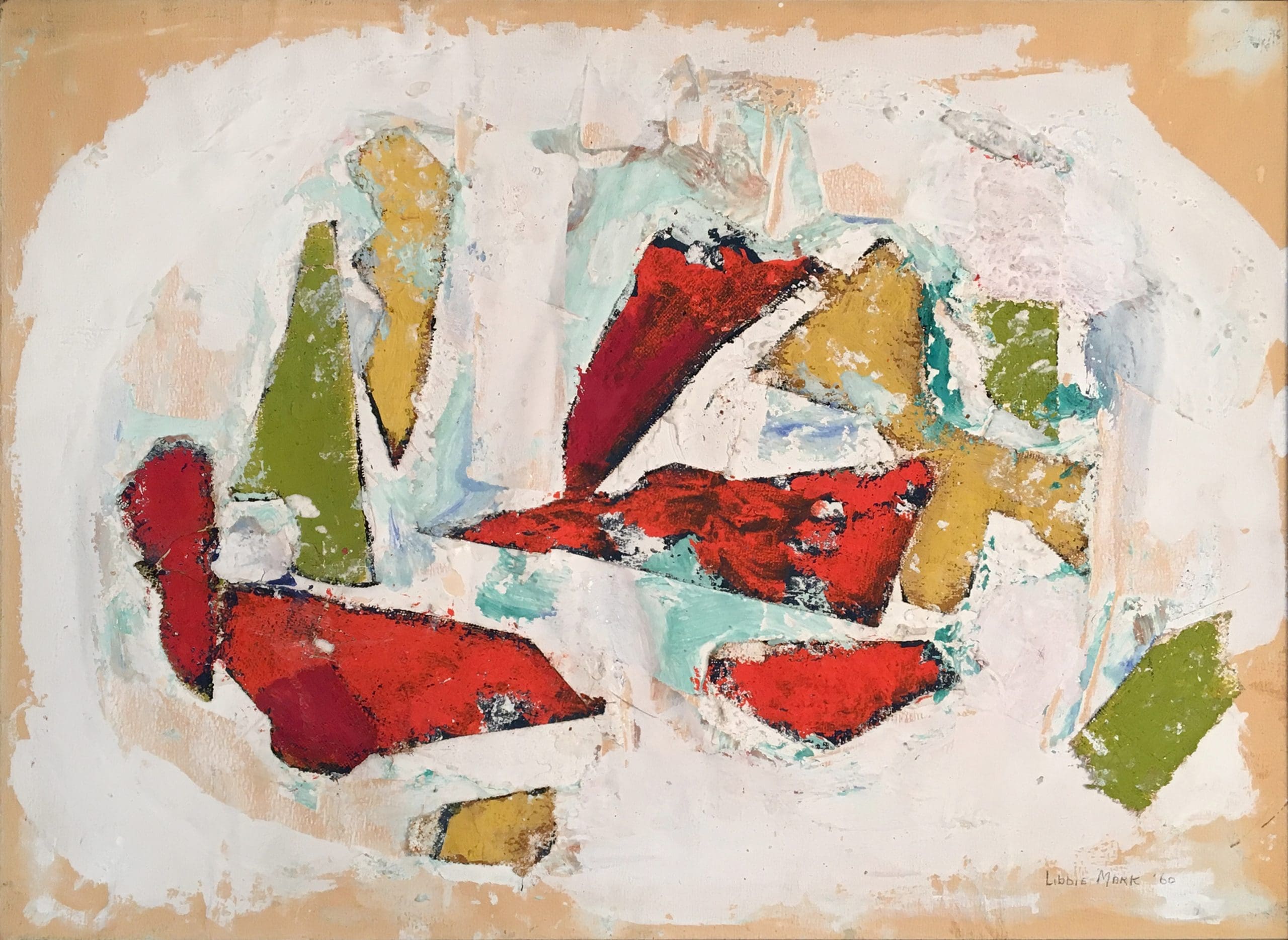 According to her family, surprisingly Mark had just one solo show. Libbie Mark: Paintings and Collages opened in May 1962 at Knapik Gallery (fig. 21). The exhibition is chronicled in brochures, clippings, photographs, and a checklist.26 Mark had begun using collaged elements in a few pieces from the mid–1950s (the earliest documented so far is dated 1956, see fig. 6) but by the early 1960s she almost exclusively incorporated paint and other materials on paper, Masonite, or canvas, to build up the heavily textured surfaces like the works in this show (fig. 22, Inv. no. 34JM). Mark was among many artists working with collage during this time, creating “the inevitable expression…of the constantly decomposing and recomposing experience of the city.”27 ARTnews, France-Amérique, Manhattan East, New York Herald Tribune, and New York Journal-American reviewed the show.28 In ARTnews, Jill Johnston described some of the works on view at Knapik: