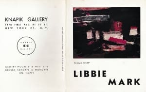 28. All review clippings are held in the Libbie Mark Provincetown Fund Collection: J. J. (Jill Johnston), “Reviews and previews: New names this month,” ARTnews 61 (May 1962): 18; Jane Jaffe, “News and Views of the Galleries: Mark at Knapik,” Manhattan East, May 24, 1962, 4; L. E. Levick, “Gallery Guide,” New York Journal-American, May 19, 1962, 7; Saint-Evremond, “Libbie Mark chez Knapik,” France-Amérique, June 17, 1962, 15; John Gruen, “Art Tour,” New York Herald Tribune, May 19, 1962, 11.