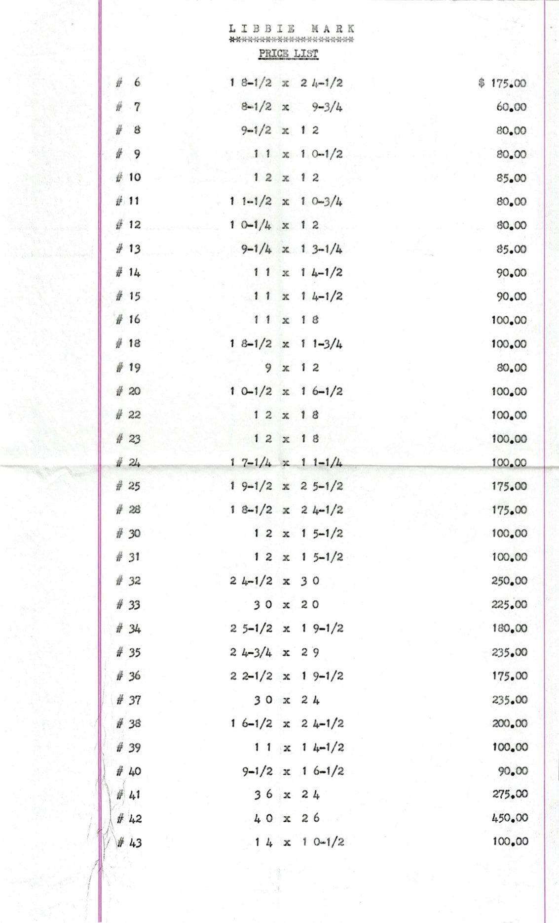 Nathan Rabin, who worked extensively for artists and collectors, such as William N. Copley, Lucien Goldschmidt, Claes Oldenburg, and Serge Sabarsky,31 photographed Mark at her exhibition (figs. 23 and 24). These photographs have been especially helpful in identifying at least ten works in the Libbie Mark Provincetown Fund collection. Eleven additional pieces not in the photographs match the pricelist descriptions (fig. 25).32