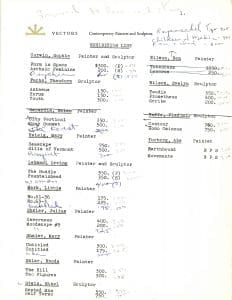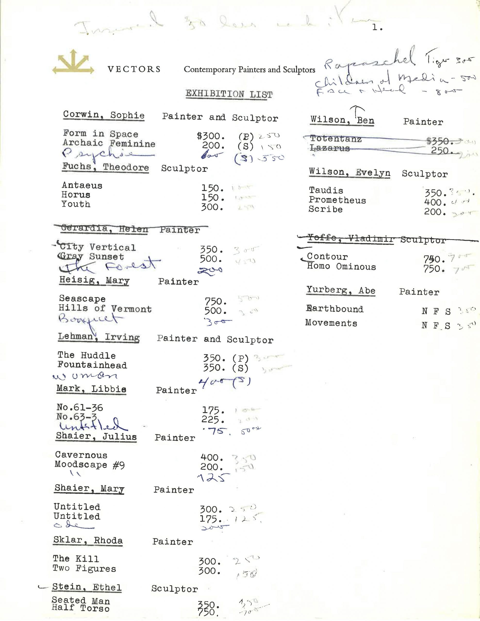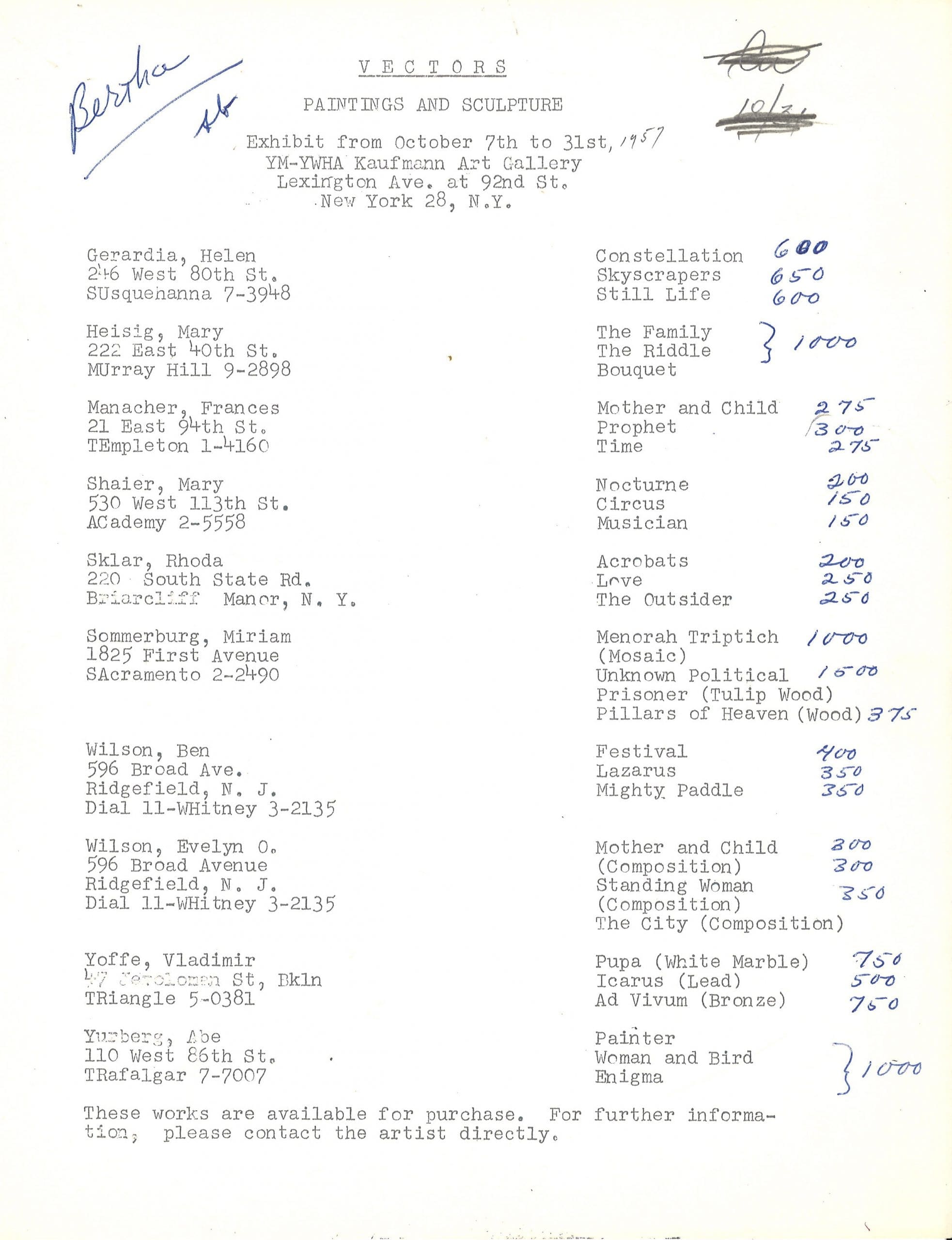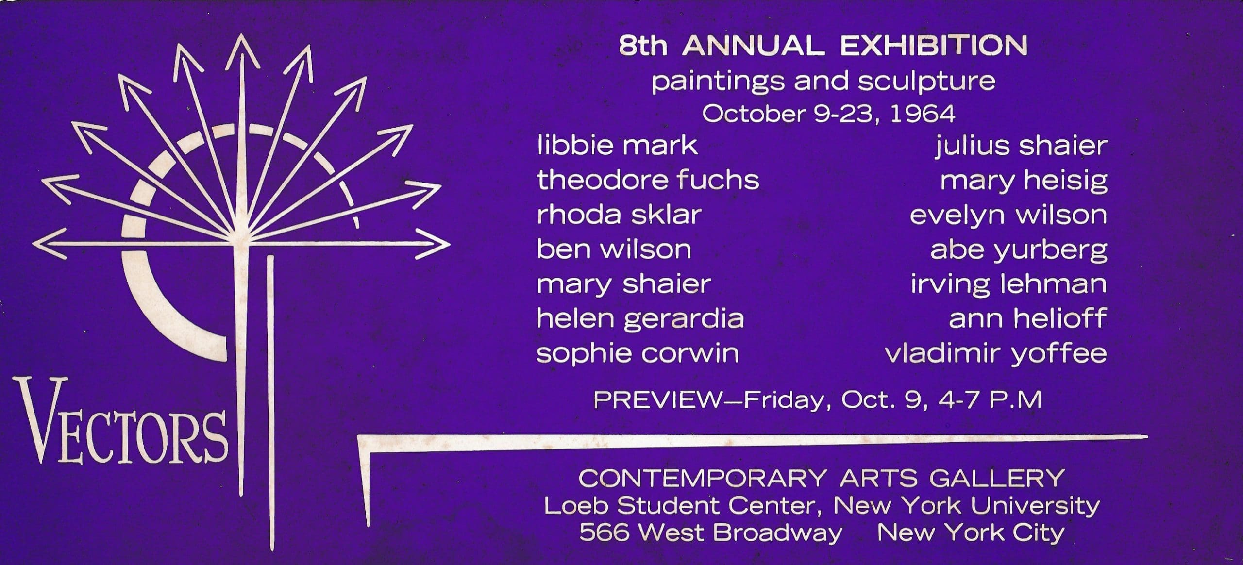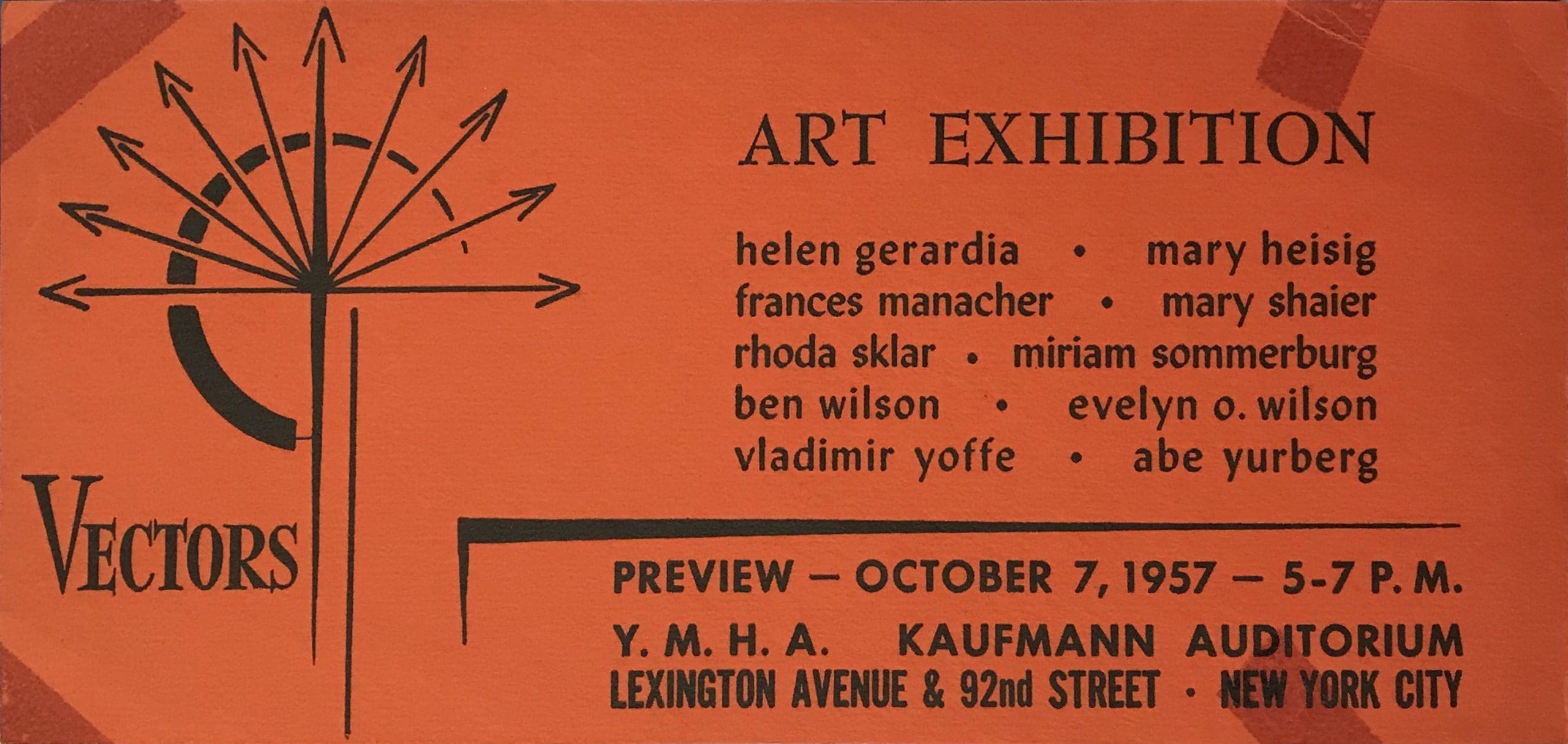 33. Postcard, Vectors Art Exhibition, October 7–31, 1957, YMHA Kaufmann Auditorium (now 92nd Street Y), New York, NY, Rhoda Sklar Platt Papers, Collection Judith and Selina Trepp; Women’s City Club of New York, “Work by the Vectors, December–January 1959,” On the Agenda XVI, no. 2 (December 1958): 2, Records of the Women’s City Club of New York, Inc., d.b.a. Women Creating Change, 1915-2011, Box 61, Folder 4, Archives & Special Collections, Hunter College Libraries, Hunter College of the City University of New York, New York City; postcards: Vectors 6th Annual Exhibition, January 13–February 3, 1963, Riverside Museum, and Vectors 7th Annual Exhibition, November 22–December 6, 1963, YMHA Kaufmann Auditorium (now 92nd Street Y), Irving Lehman Papers, Special Collections Research Center, Syracuse University Libraries; postcard, Vectors 8th Annual Exhibition; postcard, Vectors Exhibition of Contemporary Painting and Sculpture, November 22–December 21, 1964, Spencer Memorial Gallery, Anne Helioff artist file, Woodstock Artists Association & Museum Archives, Woodstock, NY; postcards: Vectors Paintings and Sculpture, May 3–24, 1959, Riverside Museum, and Vectors Eleventh Annual Art Exhibition, October 9–27, 1967, Manufacturers Hanover Trust, Ben and Evelyn Wilson Papers, George Segal Gallery, Montclair State University, Montclair, NJ.