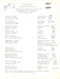 40. Capricorn Gallery exhibited Sophie Corwin, Anne Helioff, and Robert Laden. Sophie Corwin and Anne Helioff, Art and Artist Files; “What’s New in Art,” New York Times, December 18, 1966, x36, ProQuest Web. Knapik Gallery exhibited Sidney Delevante, Irving Lehman, Libbie Mark, and Ben Wilson. Artist resume, Sidney Delevante Art and Artist Files; Artist resume, Irving Lehman Papers; Exhibition announcement, Libbie Mark: Paintings and Collages; “Exhibitions,” Ben Wilson American Artist, accessed January 19, 2018, https://benwilsonamericanartist.org/exhibitions/. Harry Salpeter Gallery exhibited Irving Lehman, Frances Manacher, Ben Wilson, and Abe Yurberg. Artist resume, Irving Lehman Papers; Frances Manacher Art and Artist Files; “Exhibitions,” Ben Wilson American Artist; “Abraham Yurberg,” Ward-Nasse Gallery, accessed July 15, 2016, http://www.wardnasse.org/2200p179.htm.