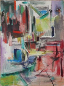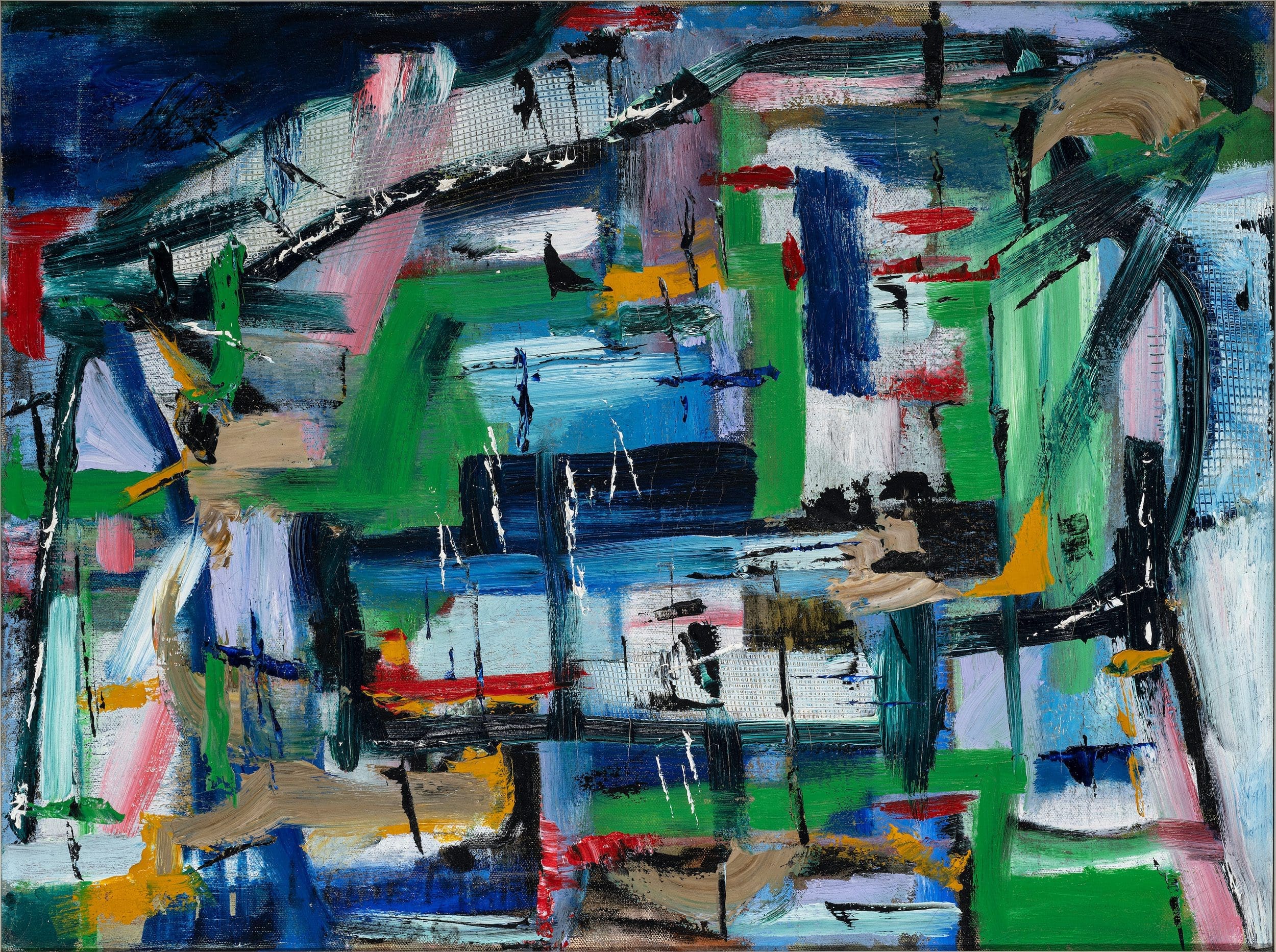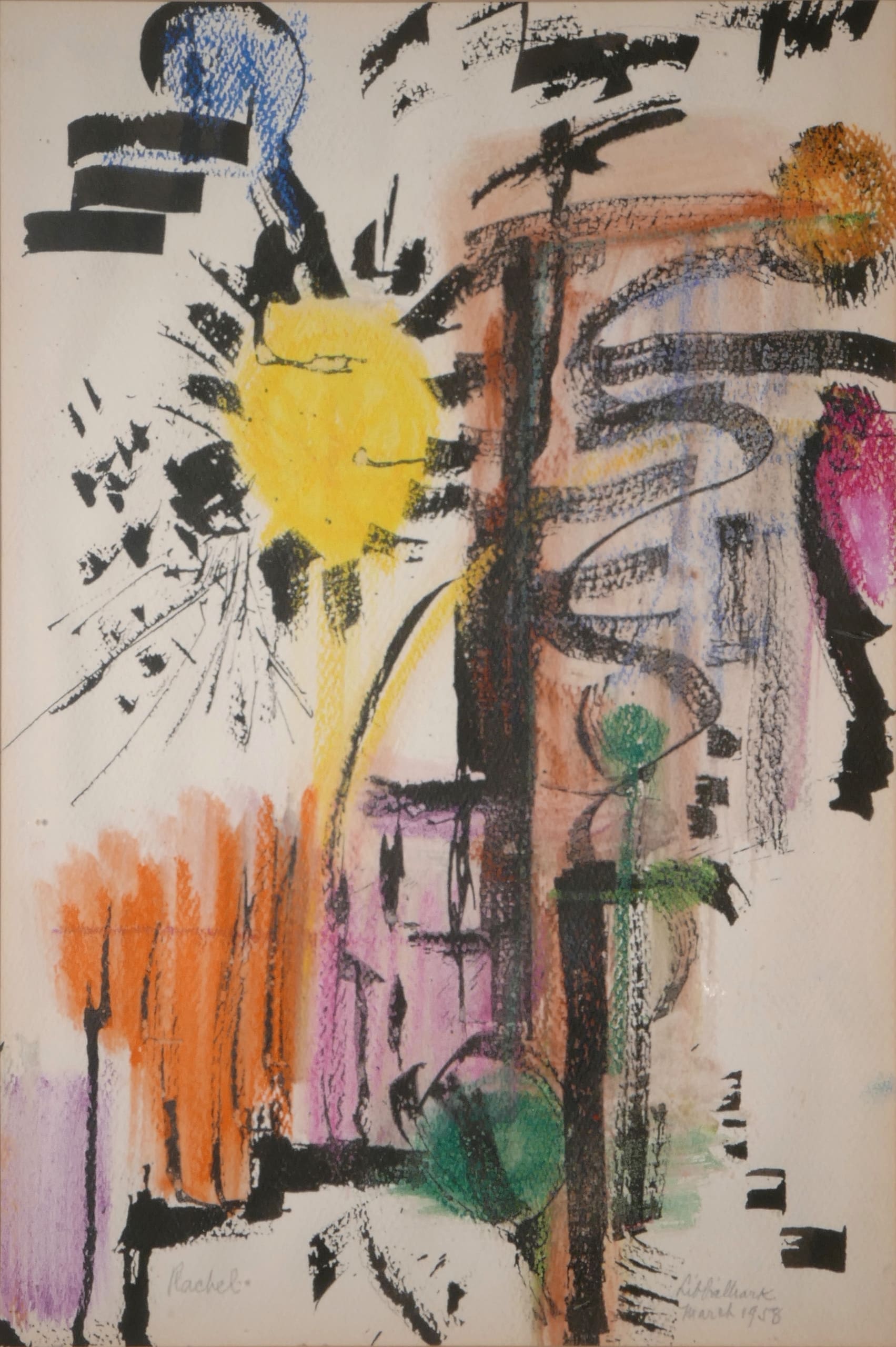 At the Art Students League, Mark took classes with Vytlacil (fig. 5), and likely met many other influential teachers, including his prominent colleagues Will Barnet, Edwin Dickinson, George Grosz, William Zorach, and others on staff at that time.9 Vytlacil was educated in the United States and Europe, Hofmann’s student and assistant in Munich in the 1920s, and taught at the Art Students League mainly between 1946 and 1978.10 Mark attended Vytlacil’s “Life Drawing, Painting and Composition” classes from December 1956 to May 1957, presumably five mornings per week at a cost of $32 per month, and from September 1957 to March 1958 at $34 per month.11, 12 A number of Mark’s pieces, some dated in the late 1950s and others that stylistically appear to be from the same period, show her increasing interest and skill in abstraction. Two untitled paintings on canvas, both dated 1956 (figs. 6 and 7, Inv. nos. 24R and 33JM) feature bold horizontal and vertical swaths of thick paint in a wide-ranging color palette. Two 1958 works on paper, one named for Mark’s granddaughter (fig. 8, Inv. no. 21J), and the other untitled (fig. 9, Inv. no. 03M), feature expressive inky brushstrokes. Further research needs to be done on Mark’s other works completed around the time of her studies with Vytlacil.13