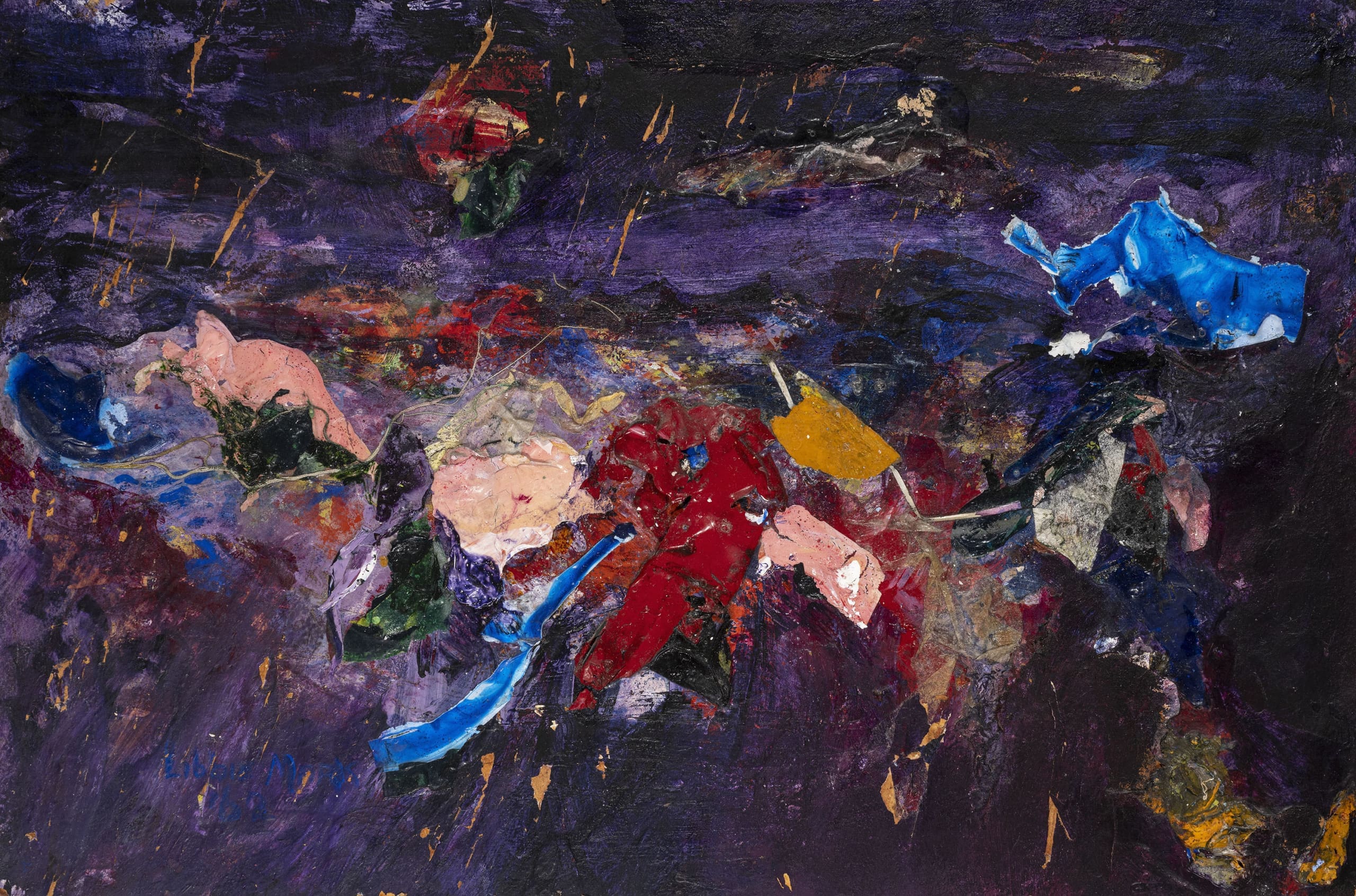 One is a high-toned noonday picture dominated by a central red that tornadoes up into yellow, surrounded by green and blue-grey. Another abstraction has a midnight carnival flavor in its deep purples and blues sparked with red and surprises of veiny greens.29